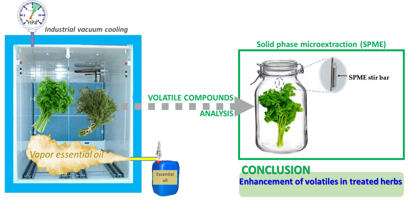 Nuevo trabajo de investigación que pone de manifiesto que el tratamiento con vapores de aceites esenciales (AEs) al final del «vacuum cooling» provoca una interesante recuperación aromática de los productos tratados. En este artículo se analiza con detalle el tratamiento de hierbas aromáticas, pero esta acción de mejora de la calidad aromática -y de conservación de la frescura del producto- la hemos comprobado también en otros productos, como otras hierbas culinarias, «brotes» (como de espinaca), lechugas, dientes de ajo fresco pelado.